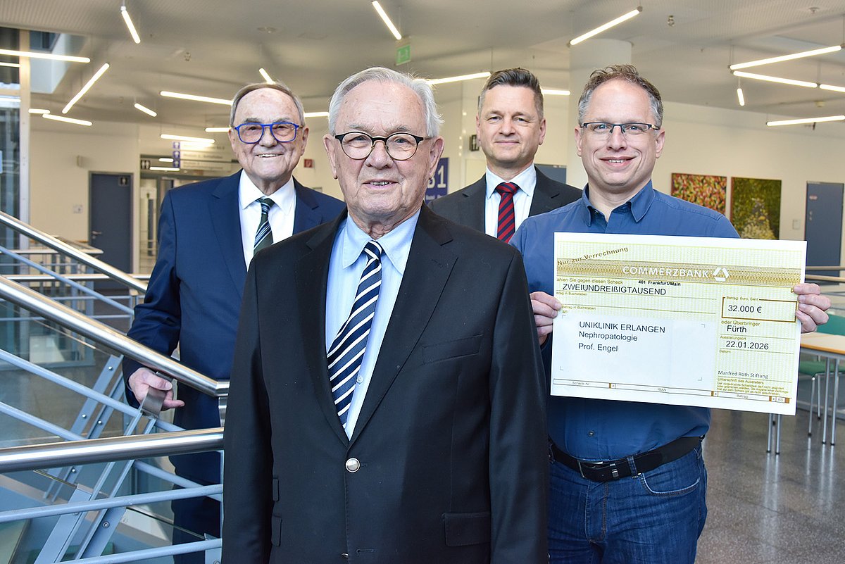 Mit einer großzügigen Spende in Höhe von 32.000 Euro ermöglicht die Manfred-Roth-Stiftung der Nephropathologischen Abteilung des Uniklinikums Erlangen die Anschaffung eines Hochleistungs-Forschungsmikroskops. Das neue Arbeitsgerät soll das Team um Prof. Dr. Felix B. Engel dabei unterstützen, vielversprechende Forschungsprojekte weiter voranzubringen. Zu den zukunftsweisenden Themenfeldern gehören der 3D-Druck von Herzgewebe, die experimentelle Forschung an Zebrafischmodellen sowie die pathophysiologischen Grundlagen von Myalgischer Enzephalomyelitis/Chronisches Fatigue-Syndrom (ME/CFS) und Long-Covid. Gerade in diesen Bereichen ist eine exakte mikroskopische Analyse von Gewebe- und Zellstrukturen entscheidend, um Krankheitsmechanismen besser zu verstehen und neue therapeutische Ansätze entwickeln zu können. Die Spende wird durch das Matching-Funds-Programm der Forschungsstiftung Medizin am Uniklinikum Erlangen auf insgesamt 40.240 Euro aufgestockt.